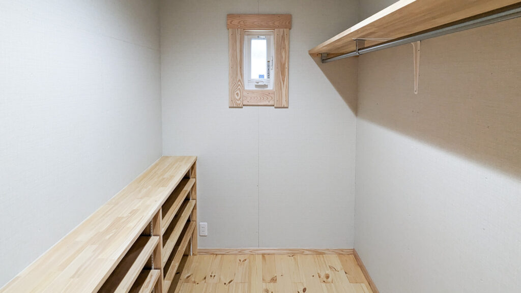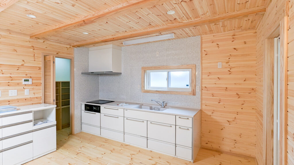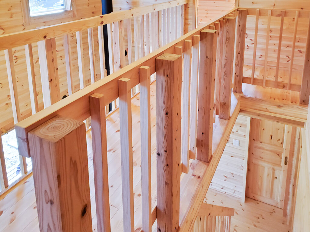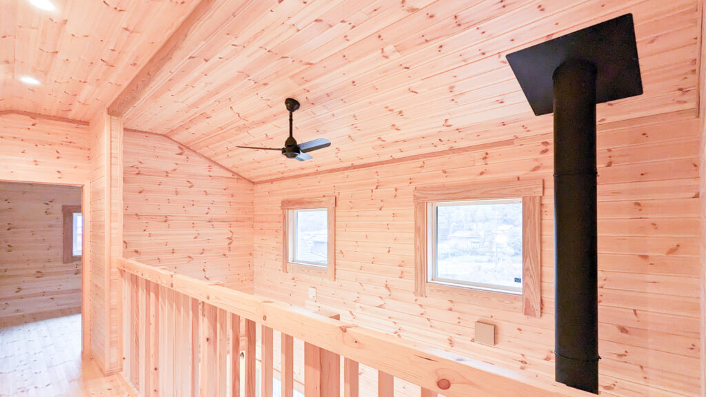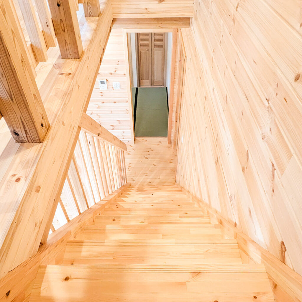 外は深い軒とデッキで“外とつながる居場所”を確保し、室内は木の香りが感じられる明るい内装で統一。吹き抜け上部のロフトは、趣味やワークスペースなど多目的に使える余白として活躍します。収納スペースも確保され、日常が整う住まいです。